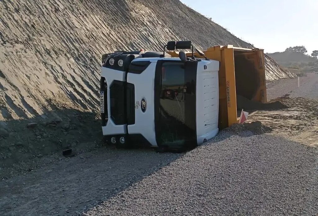 Manisa’nın Gördes ilçesinde yol kenarına park edilen kamyon kendi kendine hareket edip yol kenarına çarparak devrildi. Kazada rastgele can kaybı olmazken kamyonda maddi hasar meydana geldi.