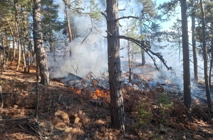 Manisa'nın Demirci ilçesinde, şimdi bilinmeyen bir nedenden ötürü çıkan orman yangınına 1 helikopter, 1...